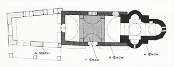 Η μεγάλη αψίδα καταλαμβάνει όλο το πλάτος του ναού. Εξωτερικά, στο ανώτερο τμήμα της, ανοίγονται επτά διπλά αβαθή αψιδώματα. Από τέσσερα αψιδώματα ανοίγονται εξωτερικά στο βόρειο και νότιο τοίχο του κυρίως ναού.