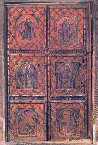Η διακόσμησή της διαρθρώνεται σε έξι τετράγωνα διάχωρα που περιβάλλονται από πυκνά αλυσιδωτά πλαίσια. Τα διάχωρα κοσμούν μορφές κάτω από κιονοστήρικτα τόξα: πάνω αρχάγγελος και ένθρονη Παναγία συνιστούν Ευαγγελισμό, στη μέση οι απόστολοι Πέτρος και Παύλος ολόσωμοι και κάτω αντωποί φτερωτοί λέοντες που παλεύουν με φίδια. Η θύρα χρονολογείται στην α΄ εικοσαετία του 14ου αιώνα.